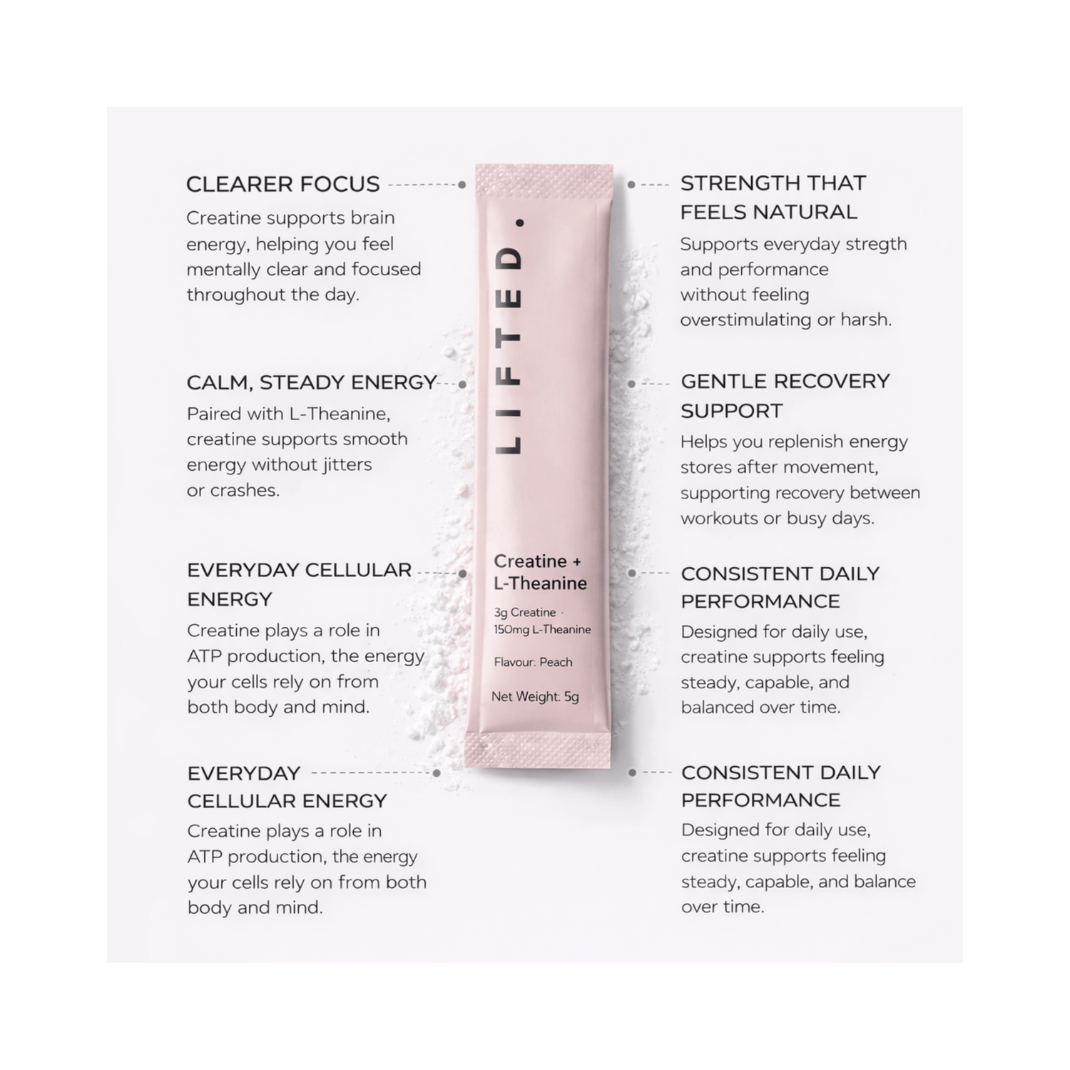 Creatine supports both mental and physical energy helping your brain and muscles produce ATP - the body’s natural energy source. It’s one of the most researched ingredients in performance nutrition, but thoroughly reimagined for daily wellness.