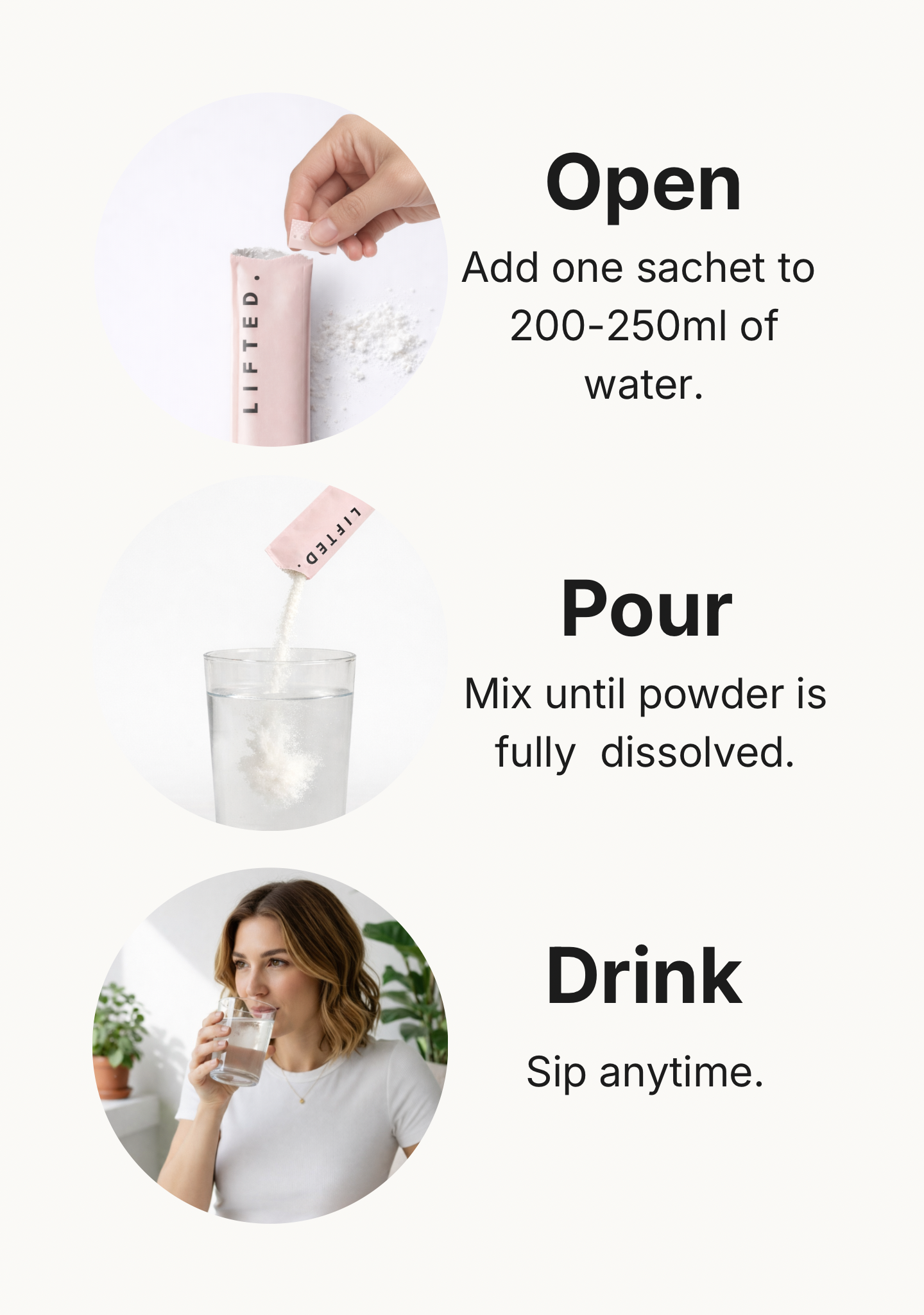 Pre-measured daily sachets make consistency effortless. No scoops, no mess, no guesswork - just a simple ritual that fits into your routine, wherever the day takes you.